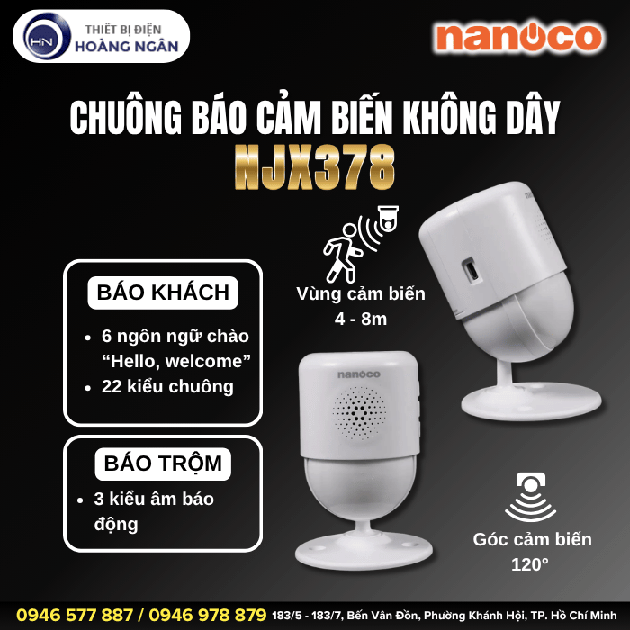 Chuông Báo Cảm Biến Không Dây Nanoco NJX378 là thiết bị thông minh giúp phát hiện chuyển động và cảnh báo hiệu quả trong nhiều không gian như nhà ở, cửa hàng hay văn phòng. Sản phẩm tích hợp cảm biến hồng ngoại với phạm vi phát hiện từ 4-8m và góc quét rộng 120°. Chuông hỗ trợ 2 chế độ sử dụng gồm báo khách với 6 ngôn ngữ chào “Hello, welcome” và 22 kiểu chuông, cùng 3 chế độ báo trộm. Ngoài ra, thiết bị cho phép điều chỉnh 4 mức âm lượng, đi kèm sẵn 3 pin AAA và có thể kết nối mở rộng với các dòng chuông ND156/ND157, mang đến giải pháp an ninh tiện lợi, linh hoạt và dễ sử dụng.