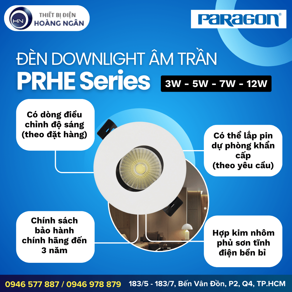 Dòng Đèn Downlight Âm Trần Paragon PRHE Series được thiết kế chuyên biệt cho chiếu sáng chiếu điểm, mang đến hiệu ứng ánh sáng tập trung, sang trọng và tinh tế. Với công nghệ chip LED Cree/Bridgelux từ Mỹ, sản phẩm không chỉ đảm bảo hiệu suất chiếu sáng vượt trội, ánh sáng trung thực mà còn tiết kiệm điện năng tối đa. Thiết kế chóa hẹp độc đáo cùng nhiều tùy chọn góc chiếu (10°, 23°, 36°) giúp PRHE Series trở thành giải pháp hoàn hảo để làm nổi bật không gian nội thất, khu vực trưng bày hay các chi tiết kiến trúc cao cấp.
