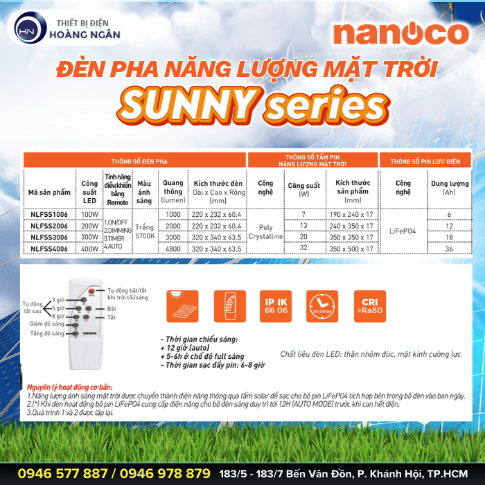 Nhanh tay liên hệ với Thiết bị điện Hoàng Ngân qua hotline bán hàng: 0946.978.879 - 0946.903.933 - 0946.577.887 để được tư vấn và nhận báo giá về Đèn Pha Năng Lượng Mặt Trời 100W - 400W NANOCO Sunny và các sản phẩm đèn Nanoco khác.
