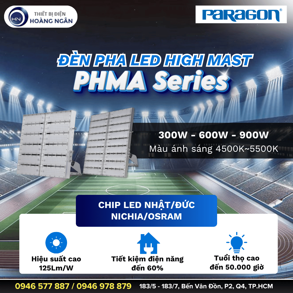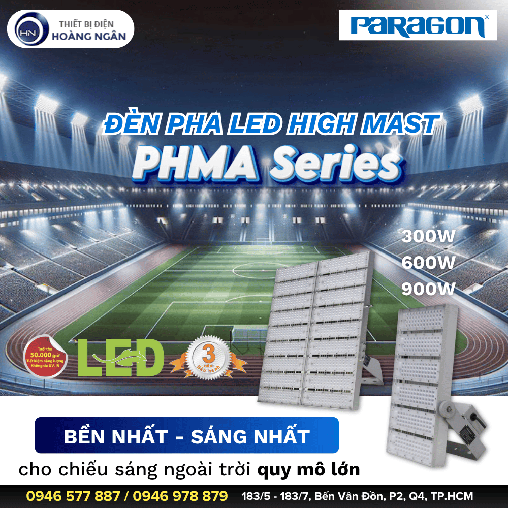 Đèn Pha LED High Mast Paragon PHMA Series sử dụng chip LED Nichia/Osram hiệu suất cao từ Nhật và Đức, công suất lớn 300W - 600W - 900W. Đèn được thiết kế chuyên dụng cho chiếu sáng ngoài trời quy mô lớn như sân vận động, bãi đỗ xe, cảng biển, sân bay,... với hiệu suất sáng vượt trội 125Lm/W. Chất liệu nhôm cao cấp cùng IP65 chống nước mạnh mẽ, giúp đèn chiếu sáng bền bỉ trong mọi điều kiện thời tiết. Tuổi thọ đèn đến 50.000 giờ.